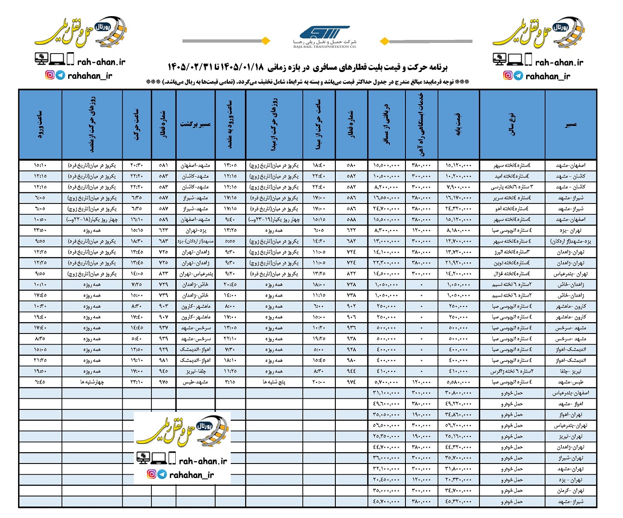لازم بذکر است در صورت ارائه جداول مشابه از سوی دیگر شرکتهای ریلی، اطلاعات به همین پست اضافه خواهد شد.