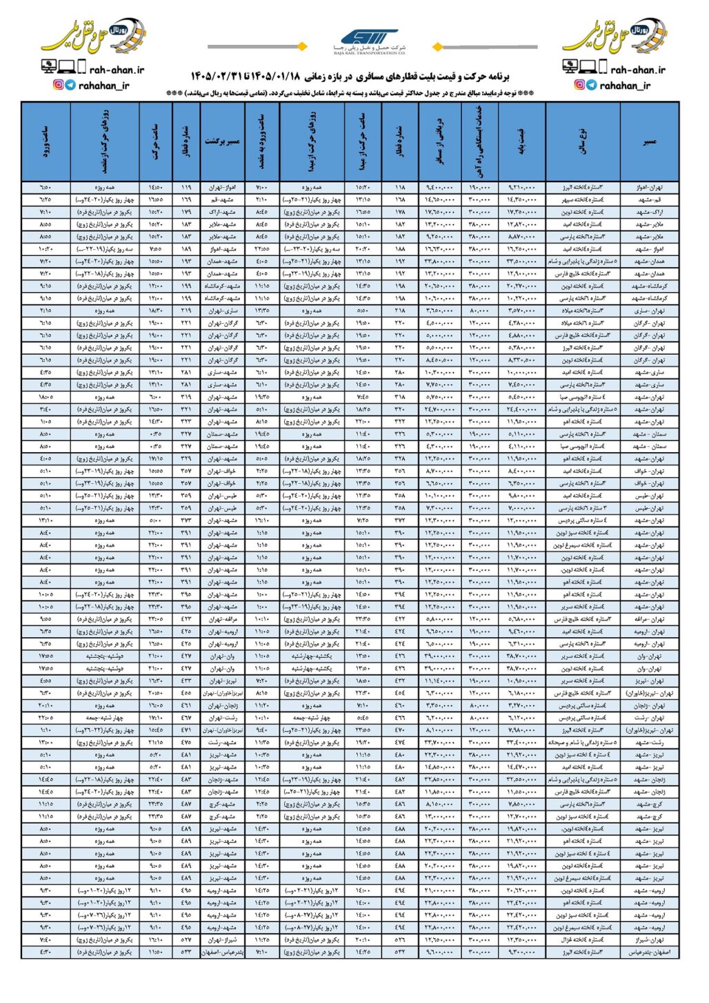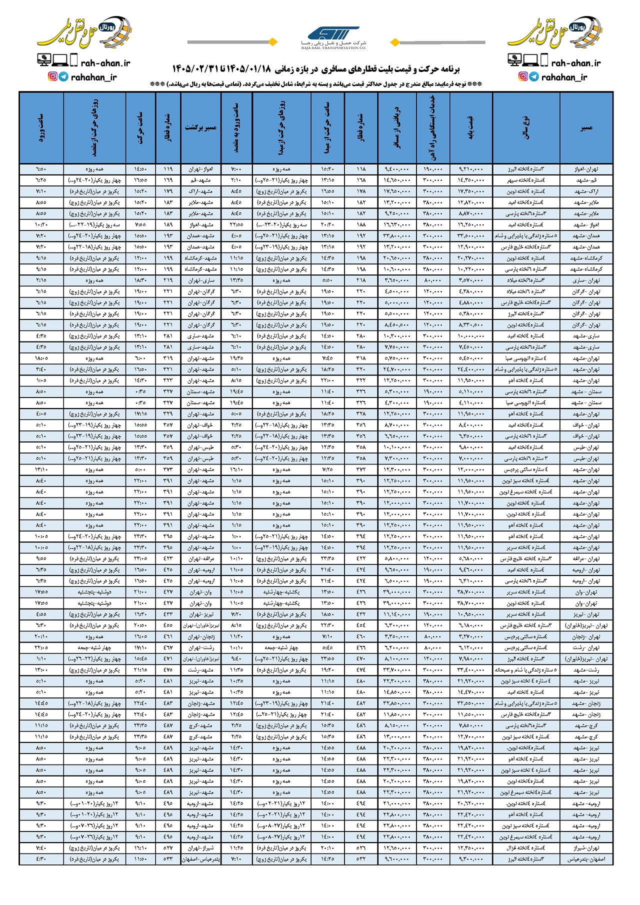 در جدول زیر که توسط شرکت حمل و نقل ریلی رجا ارائه شده است، میتوانید تمامی اطلاعات مورد نیاز قطارها را از جمله نام قطار، مسیر قطار، نوع واگن قطار، قیمت بلیط قطار به تفکیک قیمت بلیت و خدمات ایستگاهی و نهایتا قیمت دریافتی از مسافر، شماره قطار از مبدا و مقصد، روز و ساعت حرکت قطار از مبدا و مقصد را مشاهده نمایید.